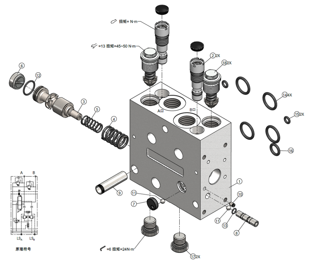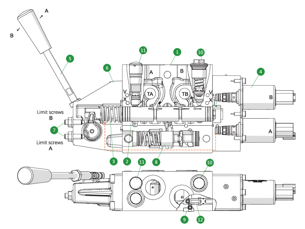 安装在阀片①中的阀芯②用于控制流体到油口(A/B)的方向和流量大小;通过改变减压阀④的电流信号,从而改变先导供油压力, 先导压力大小与主阀芯弹簧③平衡,从而改变阀芯的位移,即可改变流体到油口的方向和流量大小。亦可改变手柄⑤ 的角度可改变阀芯的位置,从而改变油口的方向和流量大小,手动模块上有限位螺钉⑦可限制手柄最大角度,从而限制阀芯最大位移;压力补偿阀芯⑧可保持阀芯②上的压 差恒定,从而不受泵的压力或者负载的压力变化影响。每 个执行器油口的 LS压力可以通过 LS 溢流阀⑪来独立设定, 亦可通过阀体底部的LSA 和 LSB来远程控制;缓冲补油阀/ 补油阀⑩可保护执行器 A/B 免受压力峰值的影响;片间梭阀⑨可将多片阀的压力比较后将最高压力传入 LS 油口,定量泵时控制首联补偿器提供所需压力流量,变量泵时传入负载敏感泵控制泵输出的压力流量。